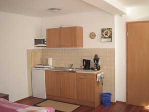 Küche mit Microwelle, Kühlschrank, Kaffeemaschine, Wasserkocher, Toaster